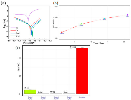 (a) Potentiodynamic polarization curves of Q355B steel treated with anti-rust coating immersed in simulated seawater solution for different times; (b) Plot of OCP versus time; (c) Corrosion current density vs. time for coated vs. uncoated.