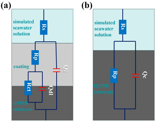 EIS equivalent circuit diagram of Q355B: (a) with coating and (b) without anti-rust coating in simulated seawater solution.