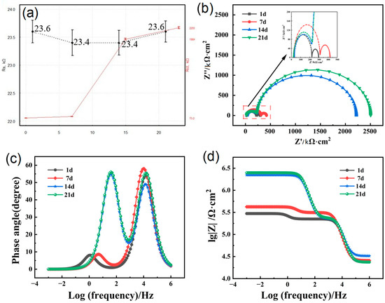 Through data normalization based on equivalent circuit fitting, Figure 6a shows the tendency of electric components. As evident from the data, the solution resistance (Rs) ranged between 23.4 kΩ and 23.6 kΩ, with little temporal fluctuation. The Rct values of the coating after soaking for 1 day, 7 days, 14 days, and 21 days were 73.2 kΩ, 108.6 kΩ, 1984 kΩ, and 2259 kΩ, respectively. The observed impedance peaks at 1 day and 21 days coincided temporally with corrosion product accumulation. Although this correlation may suggest localized ion-migration blocking, direct mechanistic confirmation requires further interfacial characterization. The <5% Rs-Rct covariance confirmed the model’s robustness against solution resistance (Rs) variations below the 5% interference threshold. It is noteworthy that the average value of the solution resistance over the four time periods was used in data processing; therefore, it has little influence on the subsequent tests. Figure 6b represents the Nyquist plots of Q355B steel treated with anti-rust coating immersed in simulated seawater solution for different times. It is clear that the Nyquist plots of each group form a semicircle, and as the soaking time increased, the radius of the semicircle also increased continuously, consistent with the Rct tendency in Figure 6a. After 21 days of immersion, the Nyquist semicircle exhibited the maximum diameter (Rct = 2259 ± 0.5 kΩ·cm2), corresponding to a 0.38% decrease in icorr compared to day 1. This temporal improvement aligns with typical polymer coating stabilization processes, though long-term durability requires further validation. This is because, as the soaking time of the coating in the simulated seawater solution increases, the phenolic hydroxyl groups contained in MG can further combine with iron ions to form a series of stable complexes, thereby inhibiting the further generation of rust. Therefore, the resistance of the coating surface to solution erosion continued to increase, and the Rct value also increased continuously, which was consistent with the Tafel analysis results. Figure 6c,d shows the Bode plots of Q355B steel treated with anti-rust coating immersed in simulated seawater solution for different times. A similar pattern can be observed: impedance decreased while phase angle fluctuations increased with increasing frequency, indicating that the structure of the bilayer on the surface of Q355B matrix underwent a complex transformation and enhanced the corrosion resistance of the material.