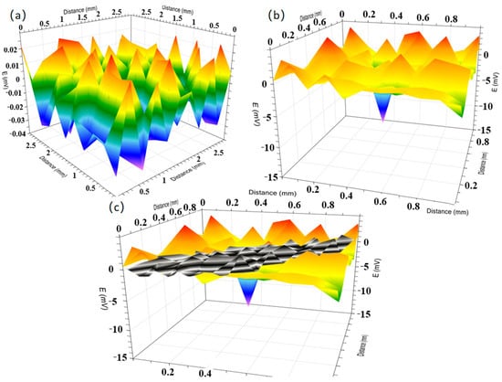 The SVET was used to evaluate the local electrochemical corrosion reaction of metals beneath the coating in the simulated seawater solution. Figure 7 displays the SVET maps of potential distribution under a 1.5 V signal applied to sample surfaces, including (a) coated samples and (b) uncoated samples. The potential scale magnitude ratio between Figure 7a,b is 1:40. To enable direct comparison, Figure 7c integrates both datasets through numerical scaling normalization. In Figure 7c, black/gray regions represent coated areas. Notably, the uncoated sample exhibits significantly greater potential fluctuations (Figure 7b) compared to the coated system (Figure 7a). It can also be found that Figure 7a indicates cathodic/anodic reaction potential fluctuations in the range of −0.032~0.023 mV, while Figure 7b indicates cathodic/anodic reaction potential fluctuations in the range of −12~4.41 mV.