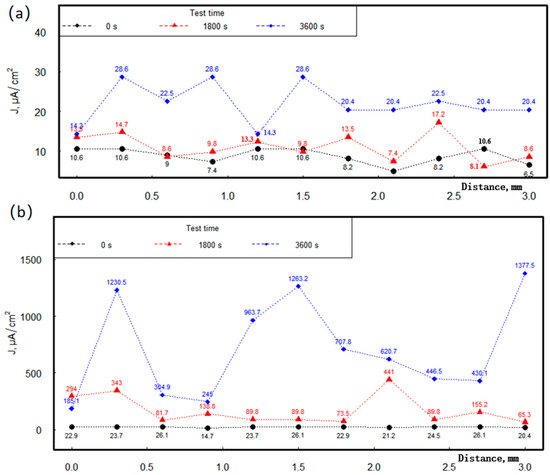 Figure 8 illustrates the distribution of micro-zone current density along the z-axis with respect to the x-axis direction in the SVET test, under a 1.5 V signal applied to the sample surfaces, including (a) coated samples and (b) uncoated samples for different immersion times. The figure provides a comprehensive comparative analysis of the 3D data in a two-dimensional manner, each data point in the figure represents the maximum value of the micro-zone current density in the y-axis direction. The distribution along the x-axis in the figure represents one test micro-area every 300 μm, resulting in 11 test points and 10 segments over a 3 mm range, corresponding to the 11 data points shown; additionally, 100 test micro-areas are distributed across the xy-plane. The black line in the figure represents the moment when the voltage is first applied to the sample, corresponding to 0 s in the legend; the red line represents half an hour after the voltage is applied to the sample, corresponding to 1800 s in the legend; and the blue line represents one hour after the voltage is applied to the sample, corresponding to 3600 s in the legend.