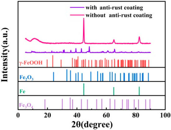 XRD spectrum of Q355B steel with and without anti-rust coating.