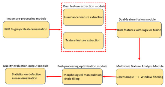 - An optimized Otsu algorithm is introduced, incorporating global gray value and standard deviation . This modification overcomes the traditional Otsu algorithm’s limitations—its reliance on single gray histograms and its ineffectiveness at integrating multimodal features such as texture and gradient—enabling the simultaneous detection of both specular reflection defects and texture uniformity variations.