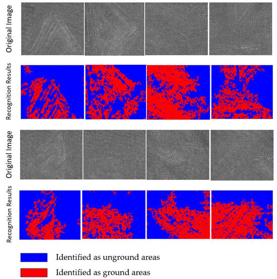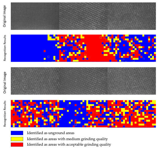 Different images were captured from multiple polishing regions, and the evaluation algorithm was applied to extract features from each image. If the extracted features substantially matched the designed features, the corresponding group was counted toward . Finally, the reliability of the evaluation algorithm was calculated. Some of the original images and the corresponding recognition results are shown in Figure 6. Comparative analysis of this algorithm versus other algorithms is presented in Table 4.