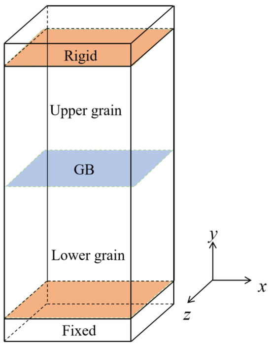Prior to the application of strain, the bicrystals were subjected to thermal equilibration. The temperature was first raised to the desired temperature (T = 300 K) and then maintained for 50 ps in the canonical ensemble (NVT). Then, the system was equilibrated for 50 ps at the desired temperature using the isothermal–isobaric ensemble (NPT) to ensure the pressure was set to zero. Periodic boundary conditions were applied in all three directions. During the tensile deformation, the periodic boundary condition was removed perpendicular to the GB plane. The top and bottom atoms, twice as thick as the cutoff radius for atomic interactions, were treated as rigid, while the other atoms were allowed to move freely. The strain-controlled tensile deformation was performed in the NPT ensemble by applying a constant velocity of 0.01 Å ps−1 in the positive direction of the y axis to the top rigid atoms, while the bottom rigid atoms were kept fixed. The velocity gradient was applied to the atoms within one-third of the upper grain. The strain rate applied in our MD simulations is similar to previous MD simulations. Although it is higher than the strain rate in experiments, it still provides details for understanding the mechanisms of material deformation. A timestep of 1.0 fs was utilized. The application of shear strain was conducted similarly to tensile strain. The difference was that the fixed velocity was set along the x direction (positive and negative x axis). The bicrystal structure is shown in Figure 1.
