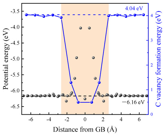 Average potential energy and C vacancy formation energy near Σ5<100>53.13° STGB. The average cohesive energy and C vacancy formation energy of bulk SiC are −6.16 eV and 4.04 eV, respectively. The GB region is represented by orange background.