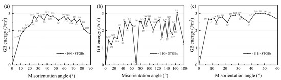 The energies of (a) <100> STGBs, (b) <110>STGBs, and (c) <111> STGBs as a function of the misorientation angle.