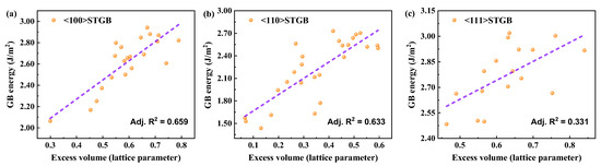 The GB energy as a function of the excess volume in (a) <100> STGBs, (b) <110>STGBs, and (c) <111> STGBs.