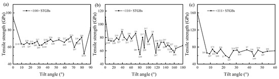The tensile strength of (a) <100> STGBs, (b) <110>STGBs, and (c) <111> STGBs as a function of misorientation angle.