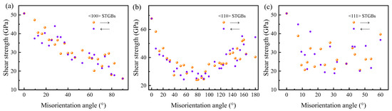 As the strain increases, the bicrystal suddenly undergoes brittle failure. The shear strength is defined as the maximum shear stress obtained in the shear stress–strain curve. Previous studies have explored the relationship between shear strength and simplified descriptors of GB, such as CSL value, GB energy, and excess volume, but no comprehensive correlations were found [29]. This study found no clear correlation between the shear strength and either Σ value or GB energy. However, there is a relationship between shear strength and misorientation angle (see Figure 6). For <100> STGBs, shear strength demonstrated an approximately linear relationship with the misorientation angle. For <110>STGBs, shear strength exhibits symmetry with respect to the misorientation angle of 90°. As the misorientation angle closed to 90°, the shear strength decreases. Next, we will show that the normal stress near GBs plays an important role in shear strength variation.