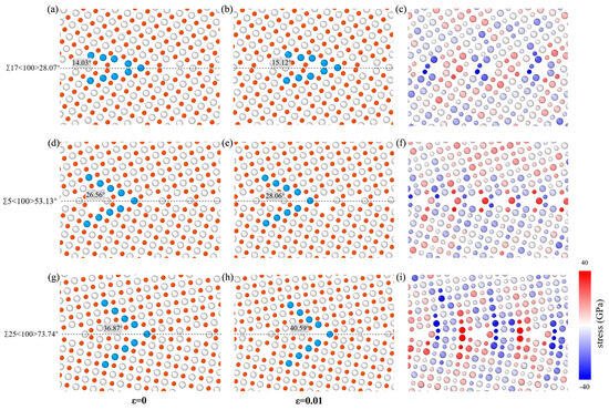 The variation in the angle between the upper grain and the GB plane of Σ17<100>28.07°, Σ5<100>53.13°, and Σ25<100>73.74° STGBs at the strain of (a,d,g) ε = 0; (b,e,h) ε = 0.01. The inset shows the angle between the upper grain and the GB plane, with the dashed line representing GB plane. (c), (f), and (i) correspond to the normal stress distribution of (b), (e) and (h), respectively. The grey and red balls represent Si and C atoms, respectively.