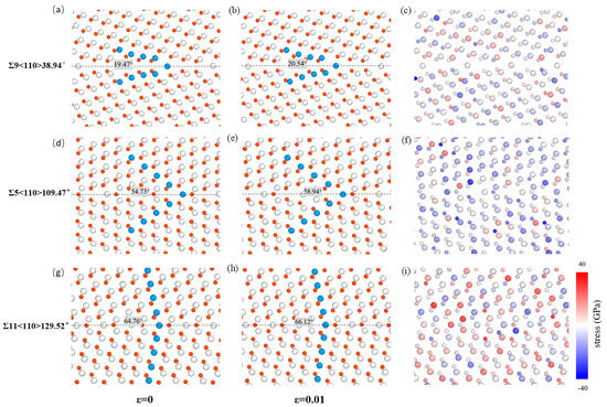 The variation in the angle between the upper grain and the GB plane of Σ9<110>38.94°, Σ5<110>109.47°, and Σ11<110>129.52° STGBs at the strain of (a,d,g) ε = 0; (b,e,h) ε = 0.01. The inset shows the angle between the upper grain and the GB plane, with the dashed line representing GB plane. (c), (f), and (i) correspond to the normal stress distribution of (b), (e) and (h), respectively. The grey and red balls represent Si and C atoms, respectively.