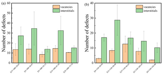 The number of survival vacancies and interstitials in the GB region for typical (a) <100> STGBs and (b) <110>STGBs. The standard deviations are shown with error bars.