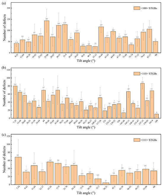 The total number of defects of STGBs as a function of misorientation angle with (a) <100> STGBs, (b) <110>STGBs, (c) <111> STGBs. The standard deviations are shown with error bars.