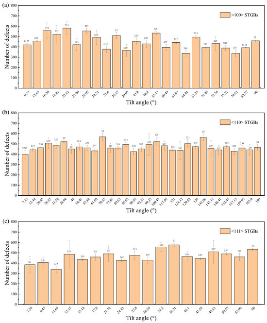 The number of defects in the GB region of STGBs as a function of misorientation angle with (a) <100> STGBs, (b) <110>STGBs, (c) <111> STGBs. The standard deviations are shown with error bars.