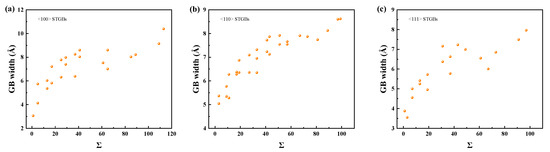 The GB width for STGBs as a function of Σ with (a) <100> STGBs, (b) <110>STGBs, (c) <111> STGBs.