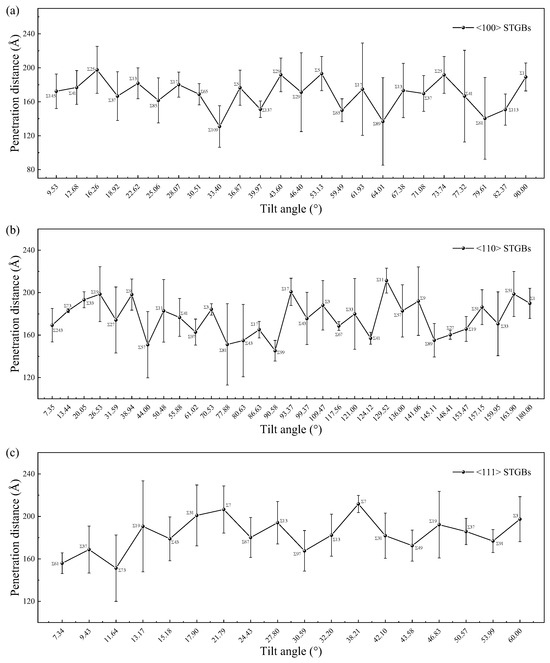 The penetration distance of STGBs as a function of misorientation angle with (a) <100> STGBs, (b) <110>STGBs, (c) <111> STGBs. The standard deviations are shown with error bars.