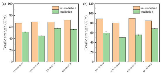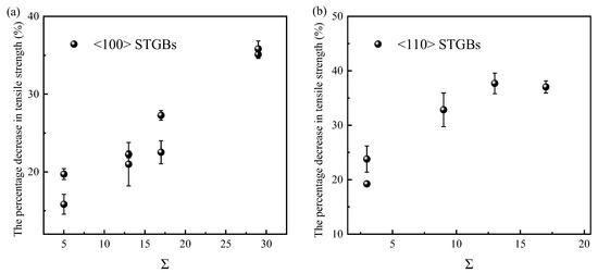 The percentage decrease in tensile strength after irradiation as a function of Σ values: (a) <100> STGBs, (b) <110>STGBs. The standard deviations are shown with error bars.
