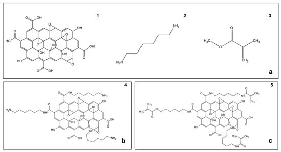 Reagents, intermediate product, and final product. (a) Molecular structure of the involved reagents: (1) Graphene oxide (GO), (2) 1,6-hexanediamine (ED), (3) methyl methacrylate (MMA); (b) Molecular structure of (4) graphene oxide functionalized with 1,6-hexanediamine (GO-ED); (c) (5) GRAPHYMERE® supposed structure.