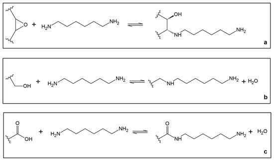 Functionalization of graphene oxide with 1,6-hexanediamine. The possible reaction for the insertion of 1,6-hexanediamine on GO is: (a) opening of an epoxide functional group; (b) nucleophilic substitution of a hydroxyl group; (c) transamidation of a carboxyl group.