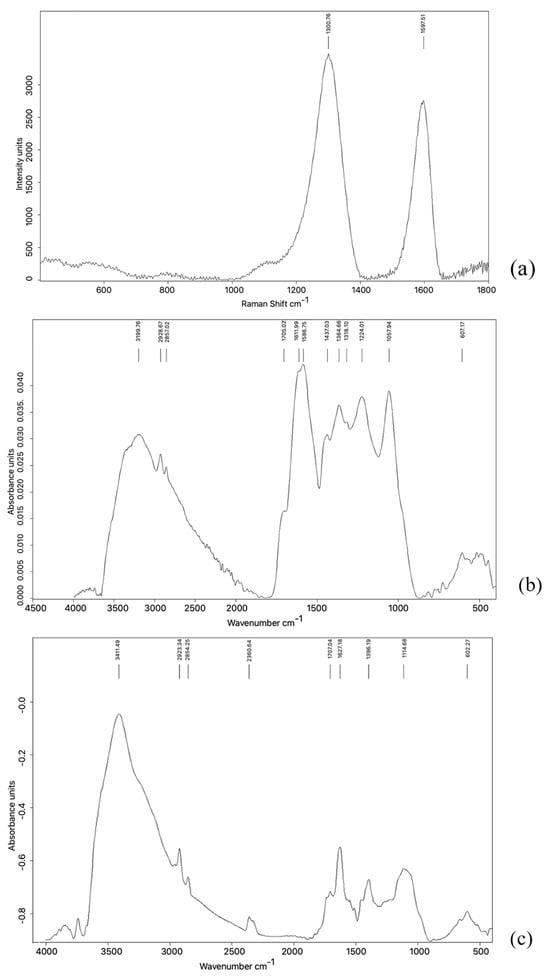 The Raman spectrum of GRAPHYMERE (Figure 4a) shows two signals at around 1301 and 1598 cm−1 (D and G bands). The IR spectrum shows a large band in the range 3600 and 1800 cm−1, with peaks at 3200 cm−1, 2929 cm−1, and 2857 cm−1. In the range 1800–800 cm−1 there are many signals overlapping with each other; among these, there are evident peaks at: 1705 cm−1, 1611 cm−1, 1587 cm−1, 1437 cm−1, 1365 cm−1, 1318 cm−1, 1224 cm−1, and 1057 cm−1. Another low wide and low intensity band group can be found in the range 800–400 cm−1.
