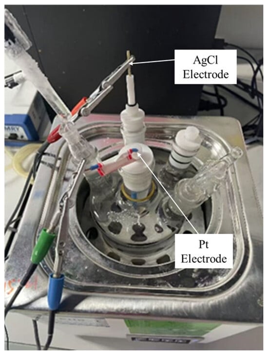 Nickel–aluminum bronze rods with a diameter of 10 mm were machined as working electrodes. Prior to testing, one end of each rod was polished to a mirror-like finish. To ensure accurate exposure area during measurements, the polished surface was exposed to the test solution, while the remaining surfaces were sealed. The test solutions included natural seawater and multiple accelerated corrosion solutions. A three-electrode system was employed, consisting of an AgCl reference electrode, a Pt counter electrode, and the nickel–aluminum bronze working electrode, connected to a CS310M (JF69) electrochemical workstation. As shown in Figure 1.