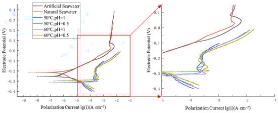 Polarization curve testing of nickel–aluminum bronze was conducted in natural seawater, artificial seawater, and five specifically designed accelerated corrosion test conditions. The detailed accelerated corrosion testing conditions are shown in Table 2.
