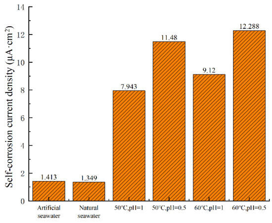 Furthermore, the data in Figure 2 and Table 2 show that at a constant pH of 1, increasing the temperature from 50 °C to 60 °C leads to a rise in the corrosion current density from 7.943 μA·cm−2 to 9.120 μA·cm−2, representing an increase of 1.177 μA·cm−2 (14.82% increase). Similarly, at a constant pH of 0.5, increasing the temperature from 50 °C to 60 °C leads to a rise in the corrosion current density from 11.480 μA·cm−2 to 12.288 μA·cm−2, representing an increase of 0.808 μA·cm−2 (10.17% increase). Compared with the 3.537 μA·cm−2 increase in corrosion current density caused by a pH reduction at 50 °C, it is evident that a decrease in pH has a more significant impact on accelerating the corrosion rate of nickel–aluminum bronze than a temperature increase. The corrosion current density diagram under different environments (except for special solutions) is shown in Figure 3.