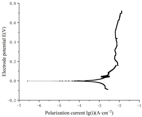 To study the combined effects of corrosion and fatigue on the mechanical properties of materials, it is essential to develop an accelerated corrosion condition that significantly intensifies conditions compared with natural seawater. Current polarization curve tests reveal that increasing temperature alone places high demands on experimental apparatus, while reducing the pH of the solution alone has limited effectiveness. Based on relevant research [24], this study proposes a special corrosion condition comprising 0.6 mol/L NaCl, 0.1 mol/L H3PO4, 0.1 mol/L NaH2PO4 buffer solution, and 1 mol/L H2O2, with a hydrochloric acid volume fraction of 0.1 mL/500 mL. Polarization curve tests for nickel–aluminum bronze were performed in this special corrosion condition at a constant temperature of 25 °C, and the results shown in Figure 4.
