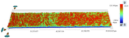 The roughness parameters include the standard deviation of height distribution (Sq), the average height difference (Sa), the maximum height (Sp), the minimum height (Sv), the difference between height extremes (Sz), the skewness of the height distribution (Ssk), and the kurtosis of the height distribution (Sku). In Figure 9 and Figure 10, the Ssk value is negative, indicating that the height data is concentrated in the higher value region, while the Sku value exceeds 3, suggesting the height distribution of the specimen surface is sharp and needle-like.