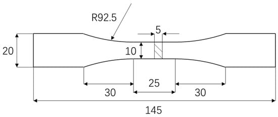 Following the requirements of GB/T 6384 [26], the thickness of test specimens is set at 6 mm. Two different cases were considered for accelerated corrosion tests, with specific dimensions of the specimens shown in Figure 5. One is exposed to corrosion for 15 days and the other for 30 days. Conditions at 25 °C comprise a solution with the special corrosion solution.