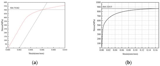 Tensile properties were measured on uncorroded virgin specimens. Specimens (geometry in Figure 11) were tested on an HDT105B electro-hydraulic servo fatigue testing machine (WanCe Testing Equipment Co., Ltd., Jinan, Shandong Province, China) at room temperature with a loading rate of 2 mm/min. Three repeated experiments were performed, and the results were highly consistent. The average results are yield strength 505 Mpa and ultimate tensile strength 864 Mpa. The stress–strain curve of one representative experiment is shown in Figure 12a,b.