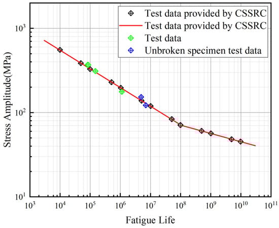 Due to variations in chemical composition and fatigue loading conditions, the S–N curves of nickel–aluminum bronze exhibit significant differences. To establish the S–N curve for the specific nickel–aluminum bronze ZCuAl8Mn13Fe3Ni2 used in this project, experimental data from corrosion-free fatigue tests (including four specimens and additional fatigue life data at various stress levels provided by CSSRC [33]) were fitted to derive the material’s characteristic S–N curve, as shown in Figure 13.