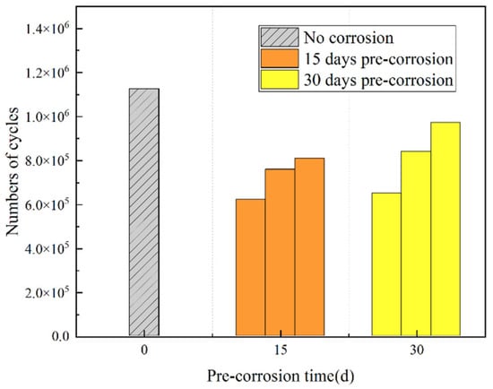 Figure 14 shows the mean fatigue life of uncorroded specimens at identical stress levels and the lifetime comparison between uncorroded specimens and those with 15d/30d accelerated corrosion exposure.