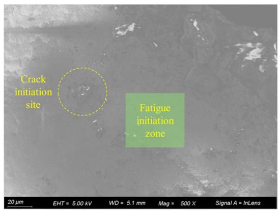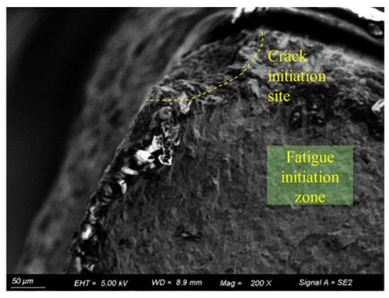Figure 15 shows the fatigue fracture surface of an uncorroded specimen. As observed in the figure, fatigue cracks in the uncorroded specimen initiated at internal particle inclusions near the specimen surface. These cracks propagated progressively under cyclic loading until the final fracture occurred.