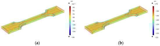 The simulated corrosion thickness after 15d and 30d of accelerated corrosion is shown in Figure 20, from which the corrosion rate can be calculated. A comparison between the numerically calculated corrosion rates and experimental results from Section 2.2 is shown in Table 7.