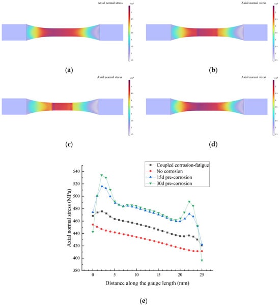 Stress distribution at failure under different corrosion–fatigue conditions: (a) No corrosion, (b) 15d pre-corrosion, (c) 30d pre-corrosion, (d) Coupled corrosion–fatigue, (e) Stress variation in the test sections of the specimens.