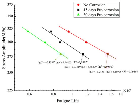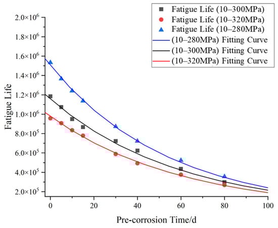 The modified S–N curves were incorporated into COMSOL to calculate the fatigue life of specimens under three stress ranges (10–300 MPa, 10–320 MPa, and 10–280 MPa) after 0, 5, 10, 15, and 30 days of pre-corrosion exposure. Based on the computational results, the fatigue life of specimens under different stress levels and pre-corrosion durations was plotted, with corresponding fitting curves generated as shown in Figure 23.