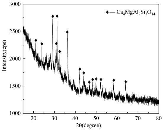 Table 1 shows the chemical composition of zinc-containing smelting slag. The chemical composition is diverse, providing a rich selection of raw materials for the manufacturing of glass-ceramics. The smelting slag contains various elements such as silicon, aluminum, iron, and calcium, which are the main components required for manufacturing glass-ceramics. Therefore, using smelting slag to manufacture glass-ceramics not only has an abundant provision of raw materials but also could adjust formulas based on the chemical composition of the slag. It produces glass-ceramics with different properties and applications. Furthermore, the physical properties of smelting slag make it an ideal raw material for manufacturing glass-ceramics. These metallurgical slags have fine particle size and good uniformity, which is extremely beneficial for the formation and crystallization process of glass-ceramics. Using the raw materials, one could control the structure and performance of glass-ceramics easily, achieving higher product quality and more extensive application fields. The XRD pattern of the smelting slag is depicted in Figure 1.
