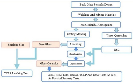 In the experiment, reagents such as quartz sand (>99%), CaO (>99%), MgO (>99%), and Al2O3 (>99%) were used for supplementation to make up for the deficiency of the main components of CMAS glass. The influence of zinc, the most common heavy metal in the smelting slag, on the structure and properties of glass-ceramics was studied using zinc-containing smelting slag as the main raw material. The flowchart of the experiment is depicted in Figure 3.