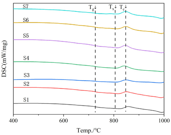 Figure 4 shows the DSC curves of water-quenched samples of seven glass matrices after melting. The endothermic peaks were not obvious in seven samples from S1 to S7. All the curves had an exothermic peak. It was the phase transition or endothermic and exothermic reactions produced from the samples in the temperature changed. The glassy substances have higher internal energy than their corresponding crystalline substances from the perspective of thermodynamics. They can release energy through crystallization or phase separation under certain conditions. The endothermic peak is not obvious due to the glass crystallizing below the glass transition temperature (Tg). Figure 4 shows that with the increase in the content of zinc-containing smelting slag, the peak temperature of exothermic for the crystallization of glass decreased from 868 °C to 841 °C. The experimental phenomenon is due to the increase in the content of Zn2+, which then forms more nucleation sites, resulting in gradual temperature decreases in the exothermic peak during crystallization, and the crystals are easier to precipitate [21]. There are small amounts of nucleating agents in the raw materials, such as zinc oxide, titanium dioxide, chromic oxide, rare and precious metals, etc. Certain temperatures allow the prepared glass-ceramics to undergo crystallization. The crystallization of the sample will make an exothermic phenomenon, and the exothermic peak is not obvious, indicating that the crystallization degree of the sample is not high [22]. The heat treatment conditions of the samples were determined based on the DSC results, as shown in Table 3. The nucleation temperature of glass-ceramics is taken as 50 °C above Tg, the crystallization temperature is taken as the peak temperature of heat release during crystallization (Tc), and both the nucleation and crystallization times are 4 h.