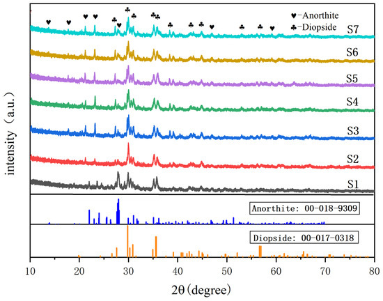 Figure 5 shows the XRD patterns of glass-ceramics with different contents of smelting slag after heat treatment at different nucleation and crystallization temperatures. The experimental results indicate that the main crystal phases of the seven groups of samples are all diopside phases (CaMgSi2O6), and the intensities and positions of the diffraction peaks of samples with different components are almost the same. The increase in the doping amount of the smelting slag causes the crystal phase type of the sample to change, accompanied by the second phase calcium feldspar phase (CaAl2Si2O8), and the intensity of the diffraction peak keeps increasing. Zinc-containing smelting slag contains nucleating agents that promote crystallization, such as ZnO, TiO2, etc. [23]. These nucleating agents play a nucleating role and increase the fluidity at the interface [24], and promote crystal growth. With an increase in the doping amount of the smelting slag let the content of the nucleating agent increases accordingly, reducing the crystallization activation energy of the sample and thereby promoting its crystallization. The diffraction peaks of the main crystal phase of the sample are mutually confirmed with the exothermic peaks of crystallization in the above DSC results, showing that as the doping amount of the smelting slag increases, Tc and ΔT decrease, and the crystal phase is more likely to precipitate. Based on the XRD data from samples S1 and S2, the reduction in silicon dioxide (SiO2) content from 6% to 2% induces a shift in the diffraction region from 25° to 32°, indicating a significant alteration in the proportion of the main crystalline phase.