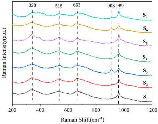 Raman spectroscopy is an effective characterization method to study the components and structural composition within glass [27]. As shown in Figure 8, the Raman spectra of all samples cover the wave number range of 200 to 1200 cm−1. Five main characteristic peaks can be observed from the Raman spectra. The Raman peak at 328 cm−1 is due to the bending vibration of the O–Si–O bond in the [SiO4] tetrahedron; the Raman shift at 515 cm−1 is anorthite phase, and this vibration is regarded as the symmetric stretching vibration resulting from the movement of oxygen atoms along the diagonal of the T–O–T bond angle; the Raman peak at 663 cm−1 is attributed to the displacement of the Si–O bridge oxygen bond in diopside the doping of iron. The Raman peaks at 908 cm−1 and 969 cm−1 are associated with the bending vibration of the Zn–O–Si bond [28] or the antisymmetric stretching vibration of the Si–O–Si bond. In the glass of doping a small amount of smelting slag, Raman spectra of slag glass-ceramics have a high consistency in peak position and shape. This phenomenon explains that Zn2+ and Mg2+ exist in the octahedron or tetrahedron in the same manner. The doping amount of smelting slag exceeds 40%, change occur in the absorption bands of the symmetric stretching vibration of the Si–O and Si–O–Si bonds, and Zn2+ enters the silicate network to form Zn–O–Si bonds [29]. Zn2+ as a network modifier can be well entered into the glass structure.