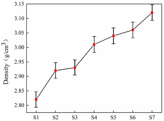 Table 4 shows the test results of physical properties such as density, Vickers hardness, and flexural strength of seven slag glass-ceramics samples with different zinc slag content. The microstructure of slag glass-ceramics determines the physical properties of materials. The basic composition of glass-ceramics is constant; the physical properties of glass-ceramics are mainly affected by the density, structure, and grain size of internal crystals. Density refers to the quality of substance contained in a unit volume, which largely depends on the chemical composition of the glass. Therefore, the study of glass density is helpful to characterize the compactness of the glass network, and then judge the structure change caused by composition change. The density test of glass-ceramics with different smelting slag doping amounts is shown in Figure 9. As the increase in doping amount of zinc-containing smelting slag increases, Zn+ content increases, cations of small radius can be filled in the interstices between the network, such as Zn+, although the connection break of silicon–oxygen tetrahedra does not cause the expansion of the network structure [30]. Consequently, the introduction of alkali metal oxides into silicate glass, such as ZnO, increases the structural compactness of slag glass-ceramics increases and the density also increases. The increase in smelting slag doping from 45.0% to 60.0%, the density increase in the sample is mainly due to the formation of high-density diopside phase and anorthite phase, which improves the microstructure.