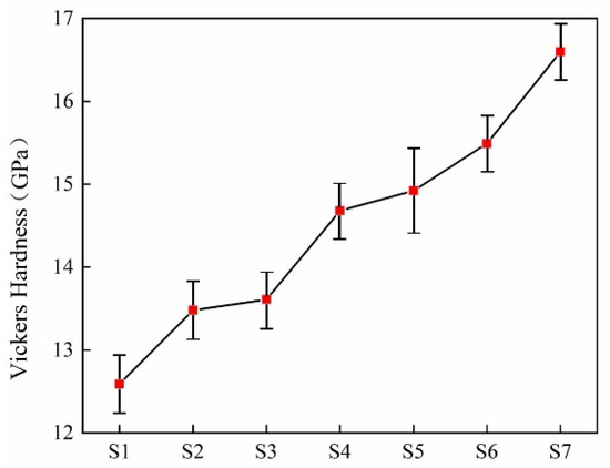 The Vickers hardness was determined by using the microhardness tester (DHV-1000, Beijing Shangliuguang Instrument Co., Ltd., Beijing, China). At least 5 points were measured for each sample to obtain the average hardness, with an error of ±0.2 GPa. The flexural strength of the sample 3 × 4 × 40 (mm) was tested by the three-point bending method using the CSS-44100 universal testing machine (Jinan Ruima Mechanical Equipment Co., Ltd., Jinan, China), and the measurement speed was 0.5 mm/min. The volumetric density was measured by Archimedes’ method.