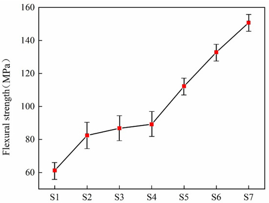 Flexural strength is the ability of a material to resist fracture when subjected to a bending force. It is one of the important indices for weighing the mechanical properties of materials [32]. A high flexural strength means that the material is less likely to fracture when faced with a larger bending force. It depends on the crystal composition and microstructure of the glass-ceramics. As shown in Figure 11, the flexural strength of the slag glass-ceramics increases with the increase in the doping amount of zinc-containing smelting slag. Due to the continuous increase in Zn+ content, the improving crystallization degree of the glass-ceramics, the uniform distribution of fine and tight diopside crystals in the glass matrix, and the diopside phase belongs to the pyroxene group, present a chain-like structure within the silicate network. Accordingly, diopside with such a structure has favorable mechanical properties. As the increase in the doping amount of smelting slag promotes the precipitation of the anorthite phase, and the crystal morphology transforms from dense spherical crystals to interlocked blocky crystals, thereby improving the microstructure of the glass-ceramics. The generation of crystals with an appropriate amount increases the fracture energy of the samples, then enhancing their flexural strength.
