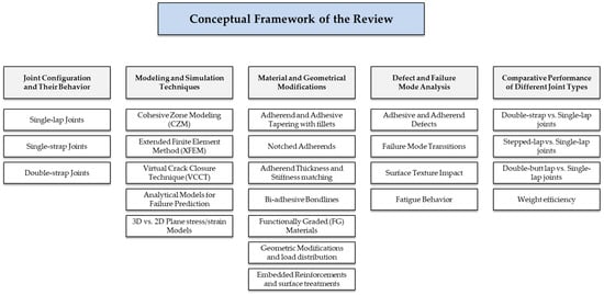 The aim of this review is to provide a comprehensive and comparative synthesis of the mechanical performance of adhesively bonded joints under tensile loading. Specifically, this work seeks to (i) critically analyze the behavior of common joint configurations, such as single-lap, single-strap, and double-strap joints; (ii) review recent advances in modeling and simulation approaches, including cohesive zone modeling (CZM), extended finite element method (XFEM), and virtual crack closure technique (VCCT), to predict failure mechanisms and load capacity; (iii) evaluate the influence of material and geometric modifications (e.g., bi-adhesive bonds, adherend tapering, functionally graded materials) on improving joint strength and damage tolerance; (iv) defect and failure mode analysis; and (v) comparative Performance of Different Joint Types. The conceptual framework guiding the thematic organization of this review is presented in Figure 1. The ultimate purpose is to offer design-oriented guidance that supports engineers and researchers in selecting, optimizing, and developing adhesively bonded joints for high-performance applications in aerospace, automotive, and structural engineering. The intended audience is engineers and researchers seeking a comprehensive understanding of recent advancements in the tensile analysis of adhesive joints.