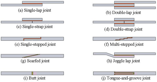 Schematic representation of various bonded joint configurations (The orange region represents the adhesive layer).