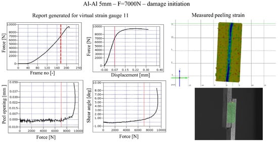 An example of a generated DIC report at the onset of damage in an SLJ configuration [9]. The four presented plots illustrate the corresponding frame number for a given applied force, the variation in locally measured vertical displacement with increasing load, peeling strain distribution, and shear angle evolution as a function of the applied load.