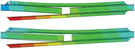 Finite element visualization of the displacement field and delamination propagation in the DSJ specimen [29]. The upper image depicts the simulated DSJ-crack model with only CZM applied to the adhesive layer, while the lower image includes both cohesive failure in the adhesive and delamination in the CFRP components. Delamination initiates near the pre-existing crack in the parent CFRP laminate and propagates into the strap laminate. Damage accumulation is concentrated on the pre-cracked side, highlighting the asymmetric failure behavior observed in the simulation.